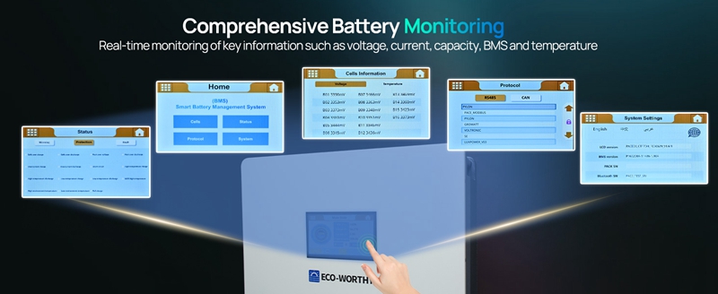 Large Capacity: 16 pieces of 280Ah high-quality Grade-A cells are connected in series, one battery can store 14.336kWh of electricity, and up to 15 batteries can be connected in parallel. Convenient Monitoring: This battery features an upgraded, larger display that clearly shows key information, including the capacity, voltage, current, temperature, and cell status of both the master and slave batteries, built-in communication interface supports connection to the host computer or inverter for communication. Dual Protection: The built-in 200A PACE BMS offers intelligent protection with high/low temperature, overcurrent, and overvoltage protection. A 250A circuit breaker with an integrated shunt trip unit ensures quick disconnection of battery input and output in case of emergencies, ensuring electrical safety. Thoughtful Installation Design:The upgraded battery features detachable terminals for easy installation and flexible expansion. It is also equipped with four durable Footmaster Nylon wheels and L-shaped brackets, allowing for effortless mobility while ensuring secure fixation in a specific position. Extremely Long Life: Designed for long-term use, the battery cell has a DOD of more than 80% after 10,000 cycles, providing you with a service life of more than ten years.