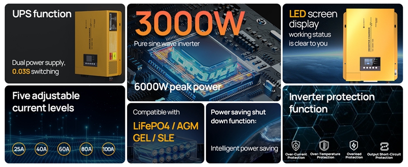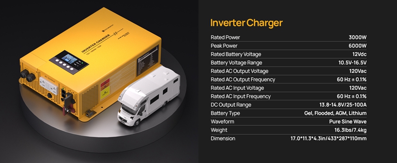 ECO-WORTHY Inverter Charger 3000W Pure Sine Wave Inverter,12V DC to 120V AC Converter Surge 6000W,25A~100A